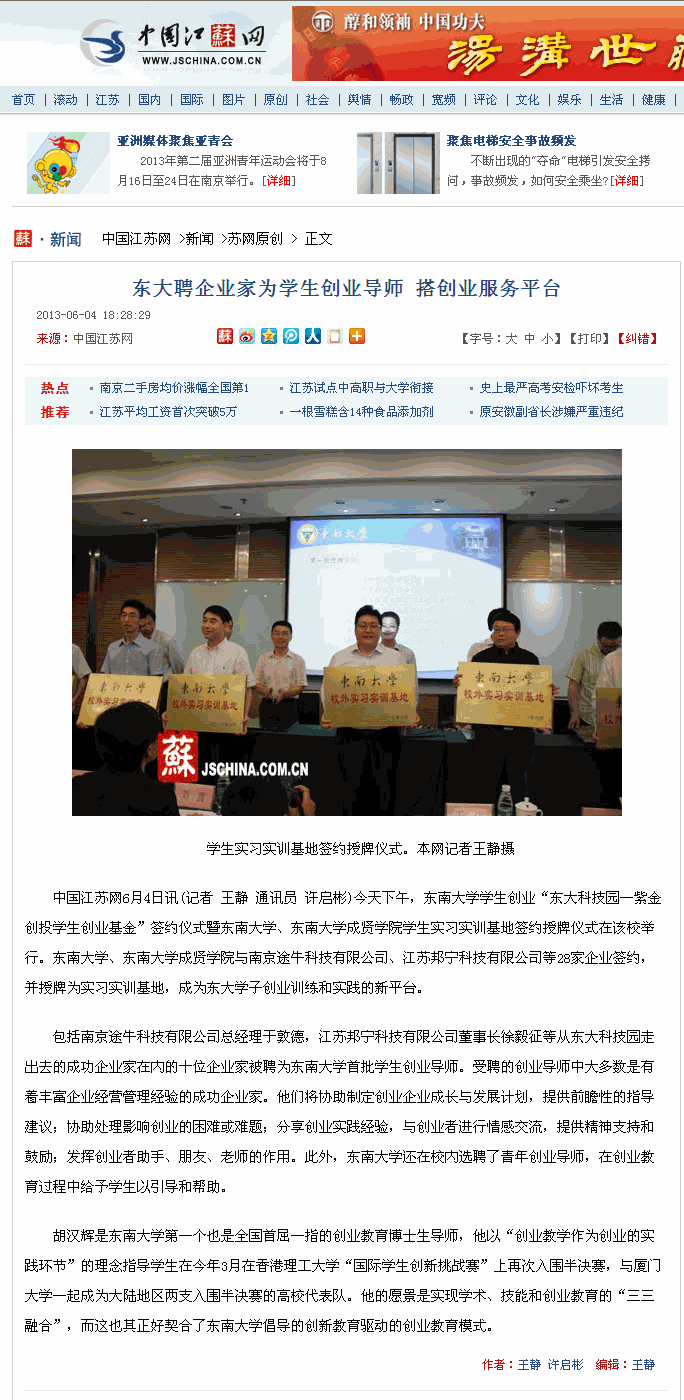 【中国江苏网】东大聘企业家为学生创业导师 搭创业服务平台