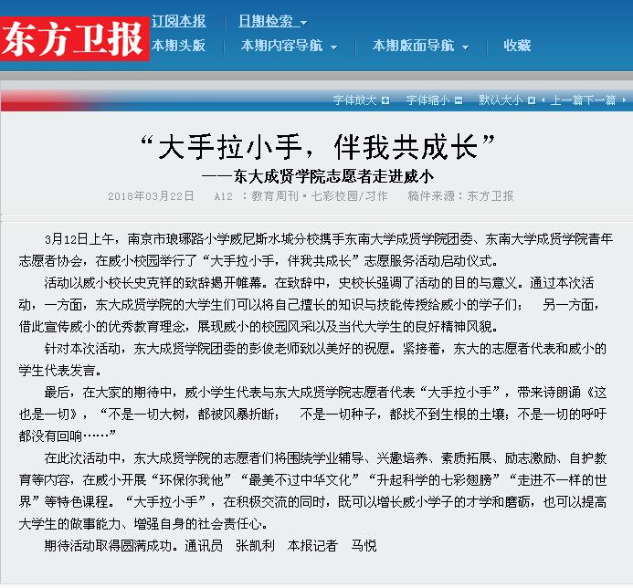 【东方卫报】“大手拉小手,伴我共成长”——东大成贤学院志愿者走进威小