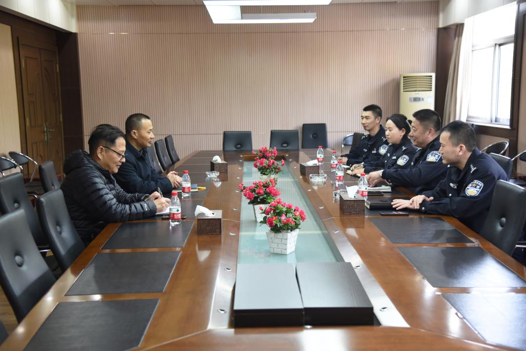 4月8日上午,泰山新村派出所宋宝钧所长、吴远屹教导员等一行四人来beat365检查指导安保工作。beat365党委书记徐悦、保卫处处长陈学建在真知馆2楼会议室进行接待。