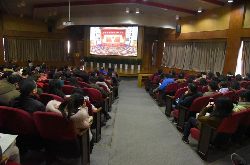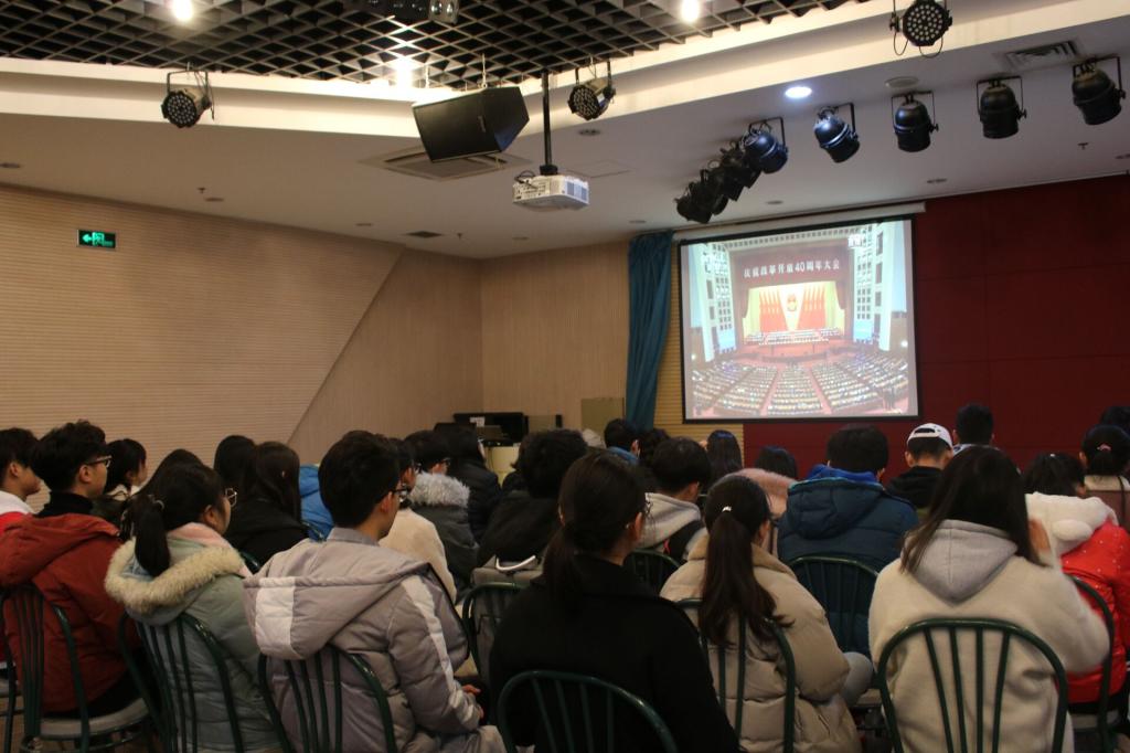 12月18日10时,庆祝改革开放40周年大会在人民大会堂举行,大会表彰了100名改革先锋,颁授了改革先锋奖章和中国改革友谊奖章,中共中央总书记、国家主席、中央军委主席习近平出席大会并发表重要讲话。成贤学院组织全院师生通过各种方式观看了大会实况直播。