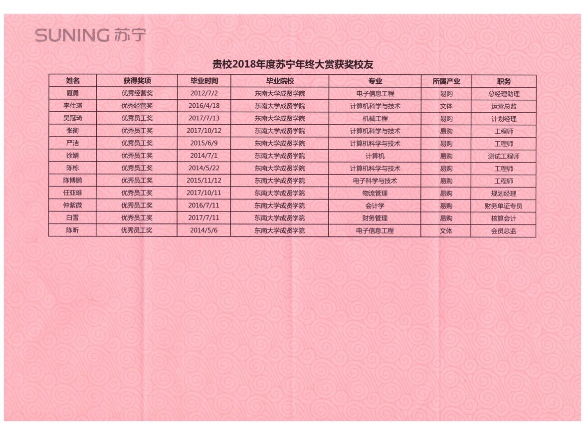 3月21日,苏宁控股集团为beat365送来喜报:beat3652012届-2017届12名毕业生,在2018年度因业绩突出,荣获集团“优秀员工奖”、“优秀经营奖”荣誉称号。