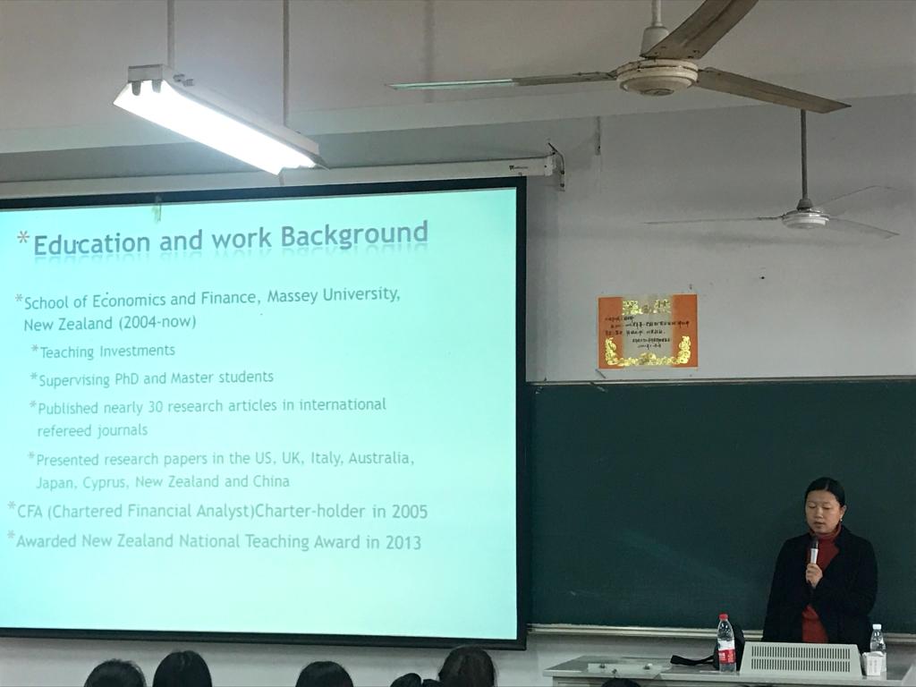 4月1日下午,新西兰梅西大学经济与金融学院金融学副教授迟晶博士访问beat365并在文昌院203教室做了学生项目专场宣讲会,200名学生现场聆听。宣讲会由发展合作处张务一老师主持。