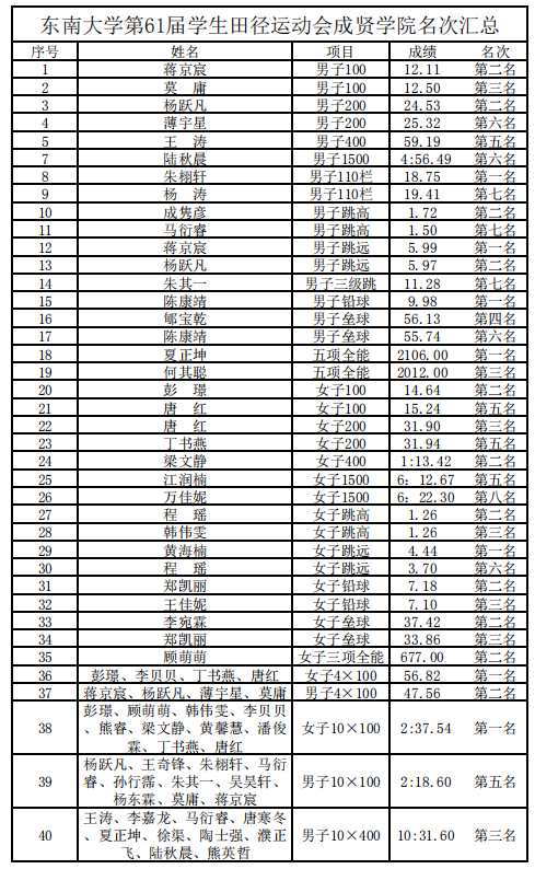 近日东南大学第61届学生田径运动会圆满结束,我院田径队运动健儿取得了男女团体总分第二名(第一名为交通学院)的傲人成绩,同时还获得男子团体总分第二名和女子团体总分第二名(获奖名单附后),所有参赛运动员都展现出了成贤学子求真求美、成人成贤的风采。