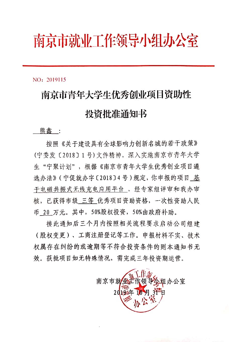 在2019年南京市大学生优秀创业项目遴选中,beat365在线唯一官网登录2016级计算机科学与技术专业熊鑫同学带领的创业团队项目《基于电磁共振式无线充电应用平台》获得三等优秀项目资助资格,获政府一次性资助20万。