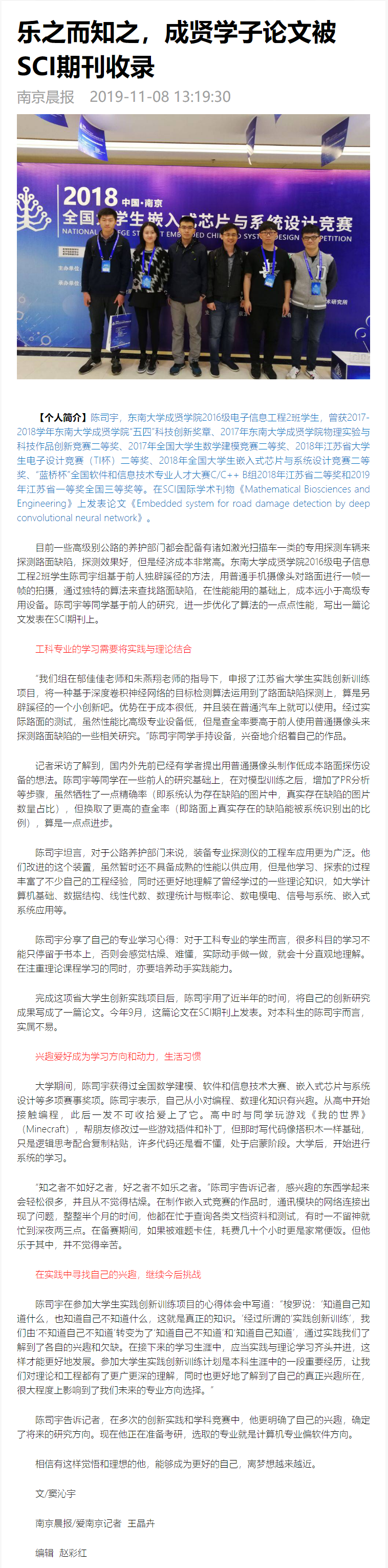 【南京晨报】乐之而知之,成贤学子论文被SCI期刊收录