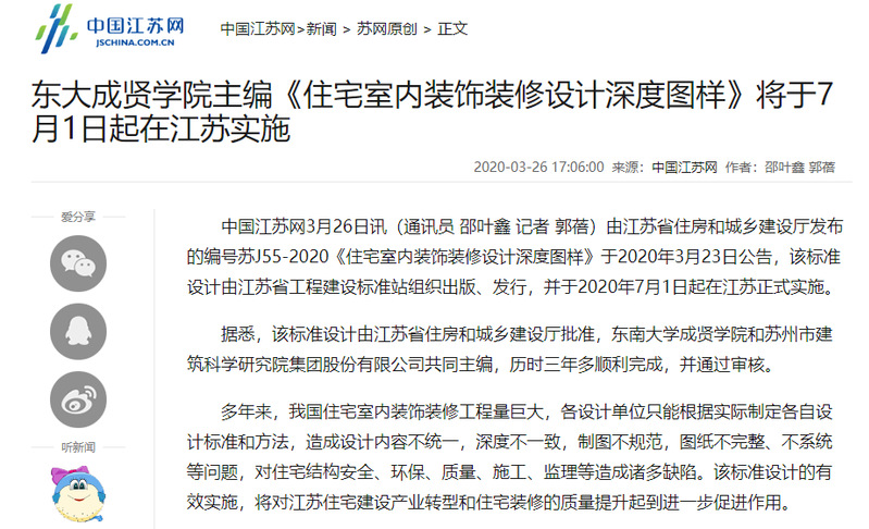 【中国江苏网】东大成贤学院主编《住宅室内装饰装修设计深度图样》将于7月1日起在江苏实施