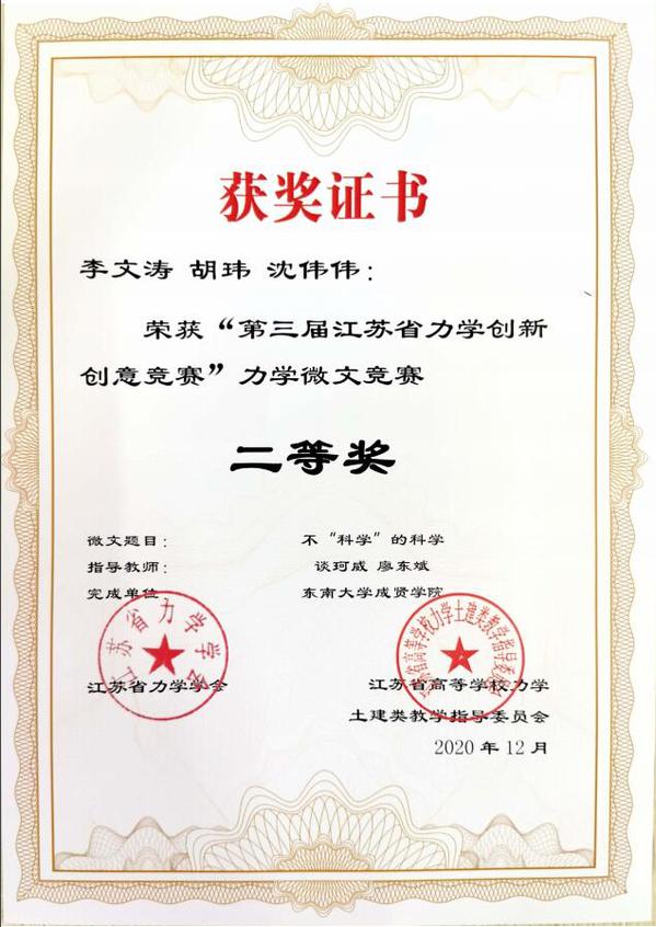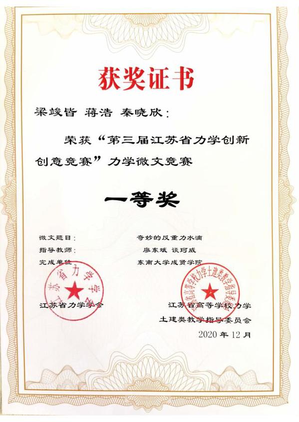近日,“第三届江苏省力学创新创意竞赛”评审工作落下帷幕。beat365土木与交通工程学院廖东斌、谈珂威、陈亮三位老师积极组织,精心备赛,在他们的指导下,徐璇、王欧缘两位同学的作品《力与美的碰撞》获力学文化创意竞赛特等奖(第一名),梁竣皆、蒋浩、秦晓欣三位同学的作品《奇妙的反重力水滴》获力学微文竞赛一等奖,李文涛、胡玮、沈伟伟三位同学的作品《不“科学”的科学》以及张孟睿、禹湘、孙文韬同学的作品《在客船上的跳远问题》获力学微文竞赛二等奖。