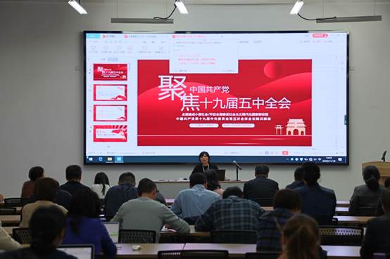会议首先由徐永红同志做《聚焦十九届五中全会》主题学习报告。报告从介绍十九届五中全会概况、“十三五”经济社会发展成就回顾、五中全会如何书写大变局下的“中国故事”三个方面深入解读了十九届五中全会的对于中国未来发展的重要意义。
