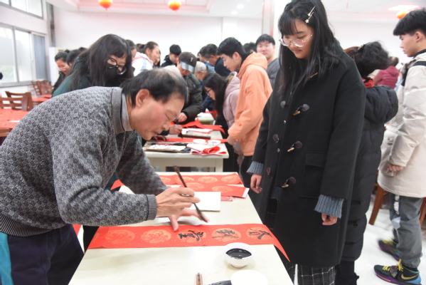 老同志们在现场挥墨泼毫、书写春联,一副副洋溢着喜气的春联跃然纸上,浓浓的情意、真诚的祝福溢于字里行间。除了“福”“寿”和喜庆吉祥的传统春联,师生们还自拟春联,互相交流和祝福,活动现场其乐融融。