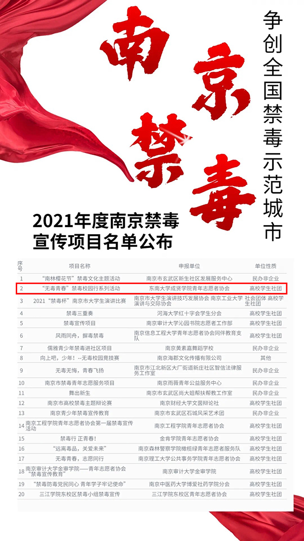 beat365青年志愿者协会2020年度在禁毒宣传工作方面表现突出,荣获“2020年度禁毒宣传优秀高校”称号;beat365制药与化学工程学院18护理专业的叶昕怡同学被评为“2020年度禁毒宣传优秀志愿者”;同时beat365“无毒青春”禁毒校园行系列活动中选2021年度南京禁毒宣传项目。