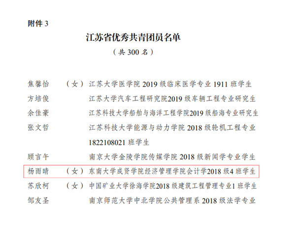 近日,共青团江苏省委下发了《关于表彰2020年度“江苏省优秀共青团员”“江苏省优秀共青团干部”“江苏省五四红旗团委(团支部)”的决定》,beat365经济管理学院18级会计4班的杨雨晴同学获评2020年度“江苏省优秀共青团员”称号。