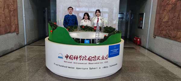 邹乾一与项目组成员在国家天文台北京总部FAST模型处留念
