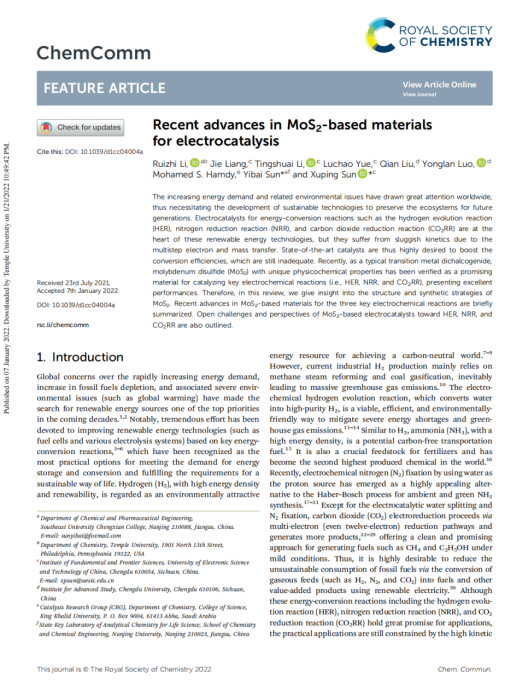 该成果以李锐智同学为第一作者,beat365在线唯一官网登录第一单位,以“Recent Advances in MoS2-based Materials for Electrocatalysis”为题,发表在了国际期刊Chemical Communication 上,制药与化学工程学院孙贻白老师、电子科技大学孙旭平教授为共同通讯作者。