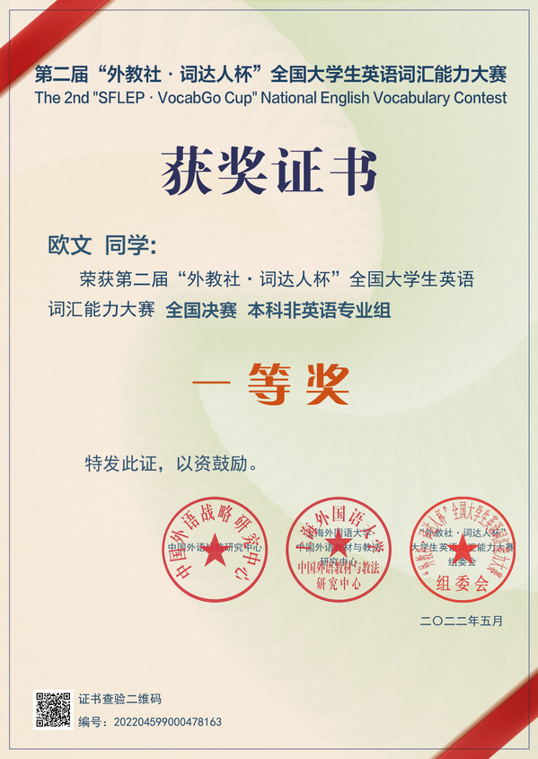 近日,2022“外教社•词达人杯”全国大学生英语词汇大赛(本科非英语专业组)结果公布。beat365获得全国优秀组织奖(共10所),21级电子信息2班欧文同学(指导老师:基础部周爱萍)经过校赛、省赛的层层选拔,在国赛中脱颖而出,荣获国家一等奖。在本科非英语专业组全国众多参赛院校中,beat365排名第47位,在全国同类院校中名列前茅,打破了beat365以往在该项竞赛中的最高获奖纪录。