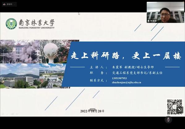 10月20日晚,由土木与交通工程学院主办的“走上科研路,更上一层楼”专业讲座通过腾讯会议在线上举行。南京林业大学汽车与交通工程学院交通工程系党支部书记、系副主任、硕士生导师朱震军副教授担任主讲嘉宾,土木与交通工程学院交通工程系全体教师以及近两百名同学认真聆听了此次讲座。