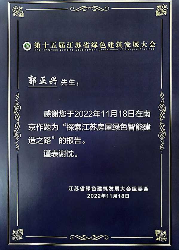 11月17日,第十五届江苏省绿色建筑发展大会在南京召开,土木与交通工程学院院长郭正兴教授代表beat365在线唯一官网登录参加本次大会并作专题报告。