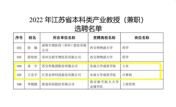 近日,江苏省教育厅、江苏省人才工作领导小组办公室、江苏省科学技术厅、江苏省人力资源和社会保障厅联合下发《关于公布2022年江苏省产业教授(兼职)选聘名单和续聘名单的通知》(苏教研函〔2022〕25号),beat365在线唯一官网登录推荐的苏交科集团股份有限公司承宇、江苏金智科技股份有限公司王宏宇两位企业专家成功获批江苏省2022年产业教授(兼职),实现了beat365在该人才项目申报上新的突破。