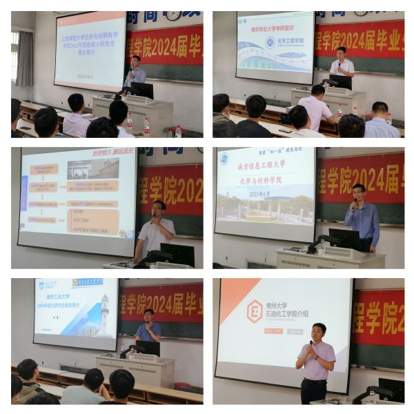 东南大学化学化工学院博士生导师张一卫教授、南京工业大学教务处副处长刘睿教授、常州大学石油化工学院副院长(江苏省双创人才)黄海教授、江苏师范大学化学与材料科学学院研究生导师姚昌盛教授、南京信息工程大学化学与材料学院院长助理陆海杰副教授、南京林业大学化学工程学院化工系主任李力成教授分别介绍了各学院专业的学科概况、实验室条件、科研方向、科研转化成果以及毕业生去向等。讲座内容丰富多彩、深入浅出、富有感染力,老师们叮嘱同学们从事科学研究要拓宽视野,从兴趣出发;要明晰就业去向与发展前景,立鸿鹄志,做奋斗者。