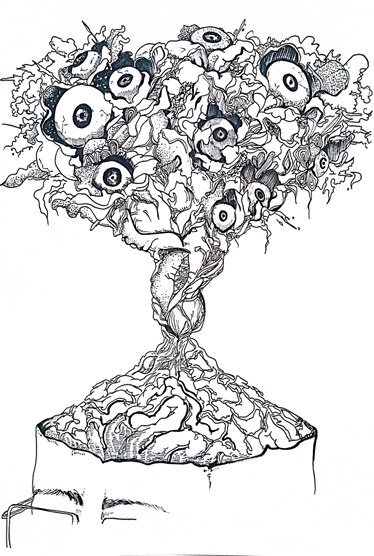 作品创意: 缤纷的人物和单调的黑白花卉形成对比,完整的脸部对比着解剖视图,希望能将注意力聚焦于人体内部的精巧结构,让我们对自身的身体结构有更深入的认识。鼻腔是嗅觉神经的所在之处,是人类最古老、最原始的感官之一。它把气味的感觉信息传递给大脑,对我们的感情和内分泌产生影响。如果我们失去了嗅觉,即便花香四溢,我们也无法领略它们的美妙。所以,我们唯有护理好自己的身体,才能更好地享受美好的生活。