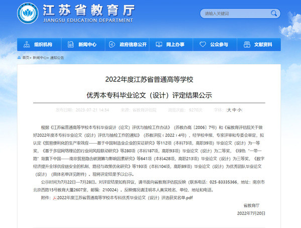 近日,江苏省教育厅发布《2022年江苏省普通高校本专科优秀毕业设计(论文)评选结果公示》,2022年beat365共上报项目11项,共获优秀毕业设计奖7项,其中个人三等奖5项,获奖率62%;优秀毕业设计团队奖2项,获奖率66%。