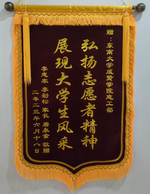 10月初,浦口区泰山街道受助群众唐永素向beat365团委志愿者工作部赠送了绣有“弘扬志愿者精神,展现大学生风采”的锦旗,感谢beat365青年志愿者对他们长期的关心和帮助。