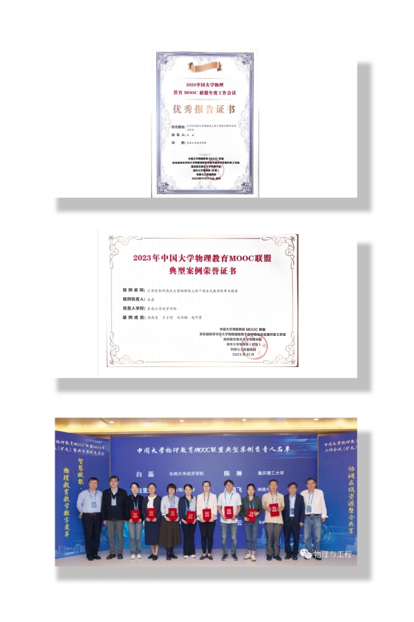 会上颁发了2023中国大学物理教育MOOC联盟典型案例荣誉证书,beat365基础部大学物理教学团队(成员:白磊、周雨青、王子煜、刘冬梅、赵阿蒙)申报的《应用型本科高校大学物理线上线下混合式教学改革与探索》案例成功入选典型案例。白磊老师作为团队负责人在课程创新应用案例分会场做混合式教学创新实践报告并获颁优秀报告证书。