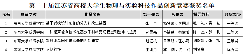 11月10-12日,第二十届江苏省高校大学生物理与实验科技作品创新竞赛在淮阴师范学院(长江路校区)举行。经校赛、省复赛遴选、决赛等环节,在与南京大学、东南大学等知名高校同台竞技的过程中,beat365进入决赛的四支代表队荣获一等奖1项,二等奖1项,三等奖1项,优秀奖1项,是同类院校中唯一获得一等奖的高校,同时竞赛总成绩在同类院校中排名第一。其中,beat365首次在论文类竞赛中获奖,取得骄人成绩。