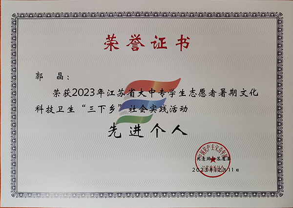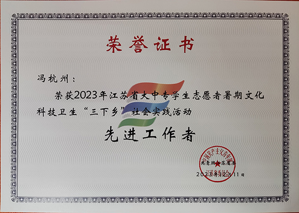 近日,由中共江苏省委宣传部、江苏省文明办、江苏省教育厅、共青团江苏省委和江苏省学生联合会联合主办的全省大中专学生志愿者暑期文化科技卫生“三下乡”社会实践活动评比落下帷幕。校团委冯杭州老师被评为2023年江苏省暑期“三下乡”社会实践活动“先进工作者”。建筑与艺术设计学院2020级风景园林专业郭晶同学被评为江苏省社会实践“先进个人”。