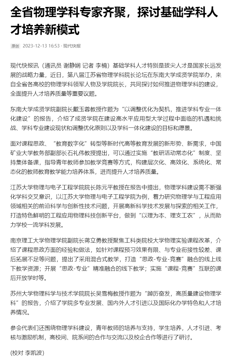 【现代快报】全省物理学科专家齐聚,探讨基础学科人才培养新模式