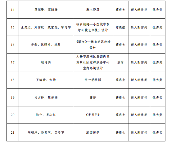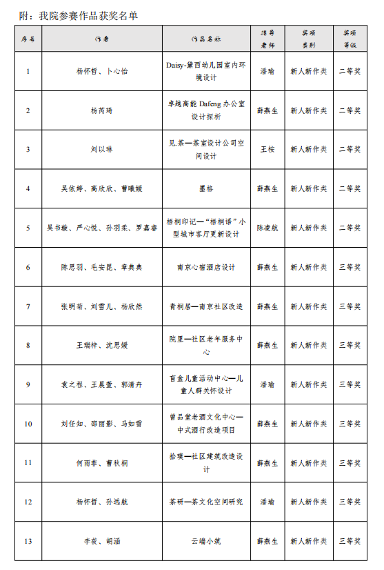 大赛经过数月作品征集和专家多轮评审,共产生一等奖19个,二等奖40个,三等奖74个。我院环境设计专业教师指导的学生团队作品荣获新人新作类二等奖5个,三等奖8个,优秀奖8个(具体获奖名单和奖项详见附表)。薛燕生教师团队创作的《南京师范大学餐厅改造》获公装方案类二等奖。王桉、潘瑜、薛燕生、陈凌航四位教师荣获优秀指导老师奖。