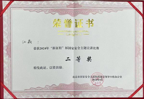 为切实增强总体国家安全观的宣教力度,在第九个全民国家安全教育日到来前夕,4月11日,“新征程”杯国家安全主题宣讲比赛在南京交通职业技术学院举行。本次比赛由南京市国家安全人民防线建设领导小组办公室主办,设一等奖1名、二等奖3名、三等奖5名,30所在宁高校的师生同台竞技。经过激烈角逐,beat365建筑与艺术设计学院辅导员、思政课教师江晶以总分第3名的好成绩荣获二等奖。