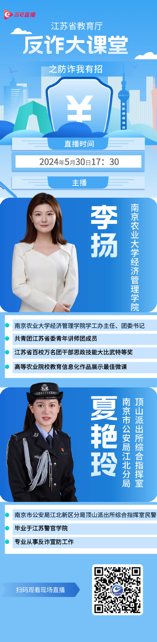 经研究,省教育厅将于5月30日(周四)下午在苏e直播平台推出“反诈大课堂之防诈我有招”直播课程,第一期邀请了南京农业大学优秀老师和南京市公安局推荐的反诈警官开展线上直播宣传活动。要求各高校组织师生观看互动,直播间也会赠送反诈小礼品。