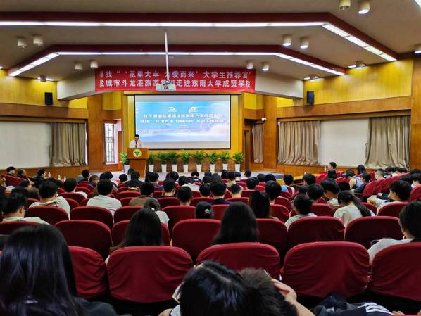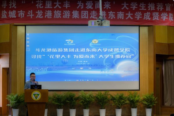 会上,在真知馆报告厅260余名师生积极参与了校企融合课堂,通过观看宣传片感受花里大丰的独特魅力。盐城大丰世遗黄海湿地公园有限公司经理朱文琦结合大丰区荷兰花海、梅花湾、大丰野鹿荡等著名景点进行了“花里大丰 为爱而来”的主题宣讲,将大丰的美景、美食、美宿娓娓道来,带领同学们了解大丰得天独厚的生态禀赋和丰富多彩的文旅资源。盐城市斗龙港生态旅游度假集团有限公司副总经理倪海浦介绍了大丰文旅行业的现状和斗龙港旅游集团在文旅、酒店方面的人才需求,并向应届毕业生们发出盛情邀约。