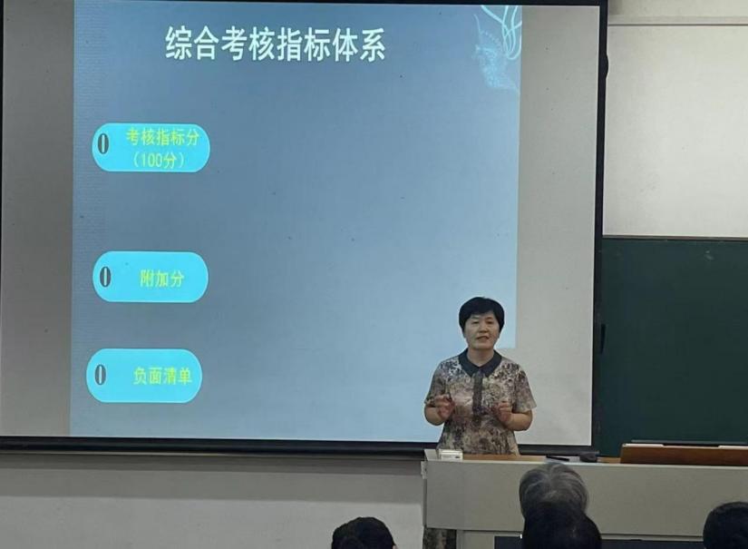 基础部党总支书记董梅芳对学校的考核文件进行了详细解读,并要求全体教职工认真学习学校文件,努力做好各项工作。