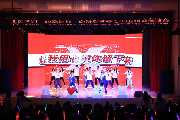 以美育人、以文化人,迎新晚会深植中华优秀传统文化沃壤,大力弘扬中华美育精神,由“初秋伊始,星辰初遇”“青春绽放,梦想起航”“携手经管,逐梦成贤”三个篇章组成。每一篇章以原创设计开启,涵盖合奏、歌舞、情景剧等多种表演形式,情感细腻的台词、充满活力的舞蹈和动听的音乐交织在一起,为广大师生呈现出一幅幅青春校园的缤纷画卷。活动在《最炫民族风》中拉开了序幕;歌舞《新贵妃醉酒》广袖舒展,红扇翻飞,感古典之魅力,传国潮之优雅;小品《军师恋盟》饶有风趣,以一场别开生面的恋爱观教育课,引得台下笑声不断;晚会现场回顾了分团委新媒体中心精心制作的军训视频,带领新生重温共同奋斗的时光,感悟自己的成长;歌曲《小美满》将晚会的氛围推向高潮,辅导员用歌声表达了对同学们满满的期望,诠释了立德树人的情怀与追求。