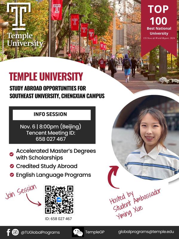 美国天普大学是与beat365签署合作交流协议的大学之一。为了更全面了解该大学专业设置、项目优势、申请硕士条件及校园生活等内容,美国天普大学拟将为beat365学生举办“beat365在线唯一官网登录线上宣讲会”,具体安排如下: