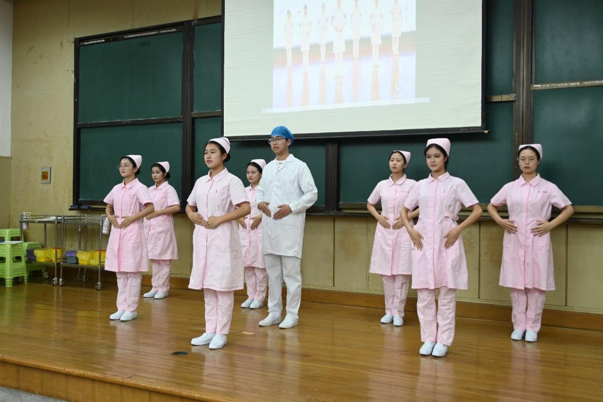 此次比赛不仅是《职业素质修养》课程的研讨和实践,也是护理专业三个年级同学同台竞技的平台,继去年的护理技能大赛之后,这是今年首次护理专业全员赛事,共有22-24级三个年级89人参加比赛。在大赛中,9支队伍的参赛选手们身着护士服,头戴燕尾帽,将护患关系中相互沟通的场景融入情景舞台剧中,还原了护士工作时的场景。他们不仅是执行医嘱的护理人员,更是有思想、有责任、有担当、有温暖的重要的医疗团队组成部分。各参赛团队集思广益、团结协作,在充分展示护士仪容、仪表、语言、沟通等基本礼仪的基础上,通过情境展示等形式将护士职业礼仪展现其中,内容涉及患者出入院护理,危重病患者心理护理,展示护理人员礼仪风貌等多个工作场景。各参赛队员自信大方、优雅得体、举止端庄,展现出了良好的精神风貌。