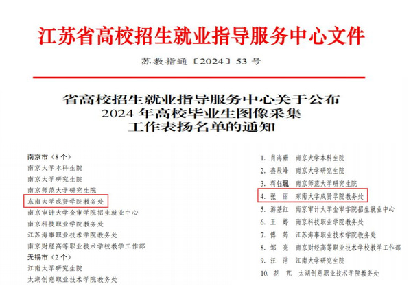 近日,江苏省高校招生就业指导服务中心发布了《关于公布2024年高校毕业生图像采集工作表扬名单的通知》,beat365教务处获评2024年高校毕业生图像采集工作优秀组织单位,教务处张丽获评2024年高校毕业生图像采集工作优秀个人。