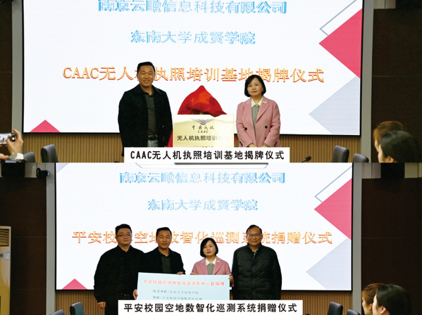 戴玉蓉副院长首先代表学校对林华桂总经理一行的来访表示热烈的欢迎。戴玉蓉副院长在致辞中表示,此次合作是学校深化应用型人才培养模式改革的重要举措。通过整合企业技术资源与高校教育优势,构建“理论+实践+认证”一体化培养体系,为低空经济领域输送高素质、专业化人才,同时也为beat365创建全国一流应用型大学、培养一流应用型人才增添新的亮点。土木与交通工程学院郭正兴院长在发言中指出,无人机执照培训基地的成立,是响应国家低空经济政策、服务区域产业升级的关键布局。未来,土木与交通工程学院将牵头与兄弟院系一起联合企业开发行业定制课程,开展技术攻关,助力无人机在道路巡检、电力巡检等场景的规模化应用。林华桂总经理对beat365领导的热情接待表示衷心的感谢,他在发言中提到,无人机技术正广泛应用于测绘、物流、应急管理、平安校园建设等领域,但行业亟需具备执照资质和实战能力的复合型人才。此次校企共建培训基地,不仅能为学生提供CAAC认证培训,还将引入企业真实项目,实现人才培养与产业需求无缝对接。随后,双方领导共同为“CAAC无人机执照培训基地”揭牌,南京云瞰信息科技有限公司向beat365捐赠“平安校园空地数智化巡测系统”一套,助力beat365平安校园建设。