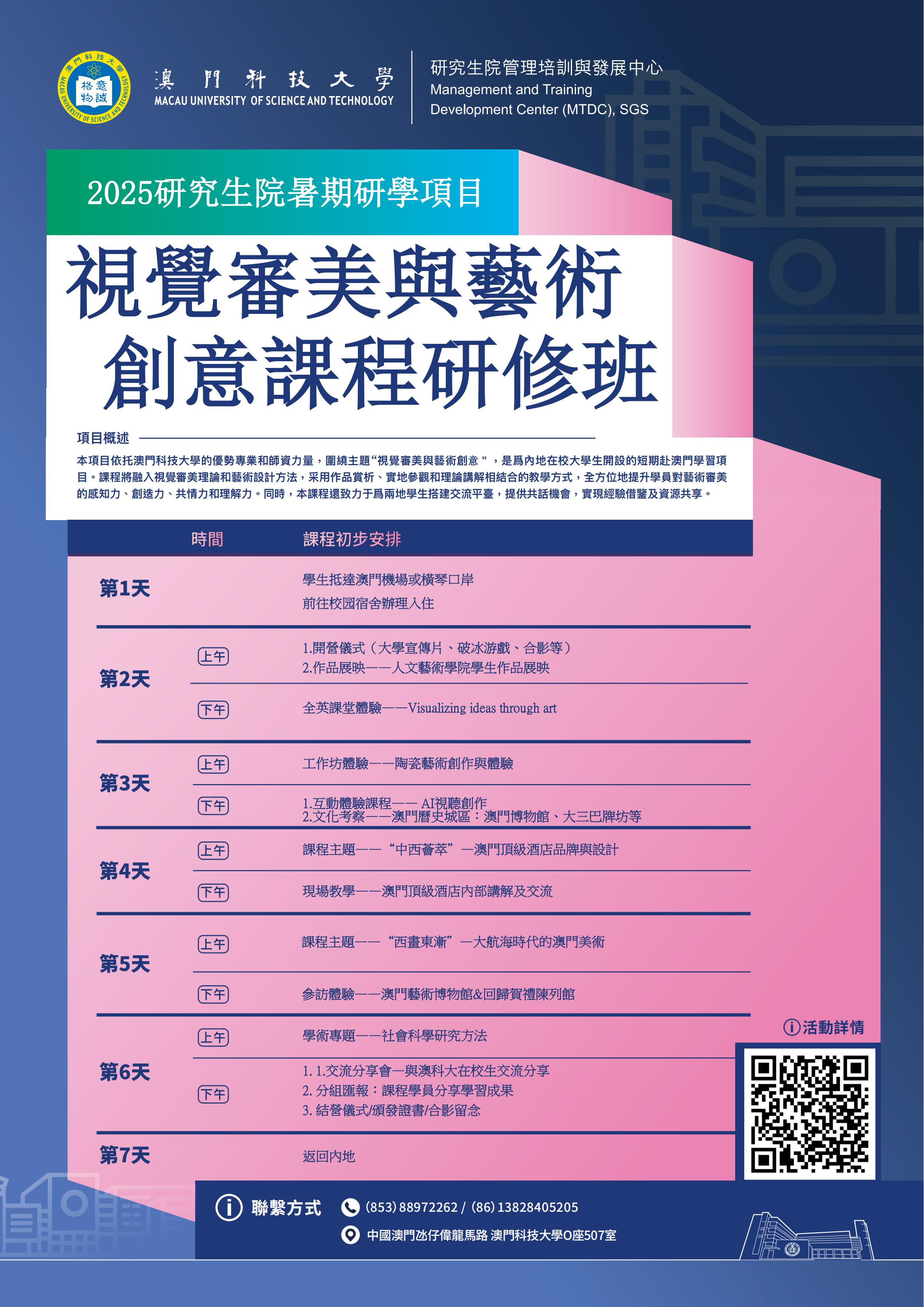 课程详情见附件正文《2025年澳门科技大学研究生院暑期研学项目》;项目结束后,学员将获得澳门科技大学研究生院管理培训与发展中心(MTDC)颁发的证书。