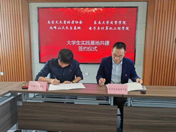 电子与计算机工程学院党总支副书记羊栋、综合办公室主任冯杭州、分团委书记杨鸿儒、软件工程党支部书记朱倩天文协会学生代表一行,受到浦口区星甸街道后圩村党总支书记董善军和南京天文爱好者协会秘书长、九峰山天文台负责人许军的热情接待。交流会上,大家就党建融合、天文科普与科技实践、大创项目合作、人才培养与资源共享等议题展开深入交流。董善军书记详细介绍了后圩村的基本情况、发展现状及工作重点与难点。羊栋副书记从学校概况、学科竞赛、中国科学院天文台大创项目、考研就业、天文协会建设等方面,展示了电子与计算机工程学院的发展情况及取得的成果。许军秘书长围绕会员组成、科普活动、科研合作、项目开发及对外交流等方面,系统介绍了南京天文爱好者协会及九峰山天文台的特色工作。随后,羊栋副书记与后圩村党总支书记董善军签署了党建共建协议,与南京天文爱好者协会秘书长许军签署了大学生实践基地共建协议