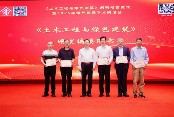 5月25日,由江苏省土木建筑学会主办、《土木工程与绿色建筑》编辑部承办的《土木工程与绿色建筑》创刊号首发式暨2025年绿色建造学术研讨会在南京召开。江苏省土木建筑学会理事长缪昌文院士,江苏省科协秘书长范银宏,东南大学教授刘加平院士,省学会副理事长路宏伟、刘永刚、陆伟东、张雁、蒋振雄、王华,秘书长卢红标等来自全国高校、科研院所、行业企业及管理部门的专家学者200余人齐聚一堂,见证期刊更名改版的历史时刻,共话土木建筑绿色转型的时代命题。beat365土木与交通工程学院院长郭正兴教授应邀参会并获聘该杂志编委。