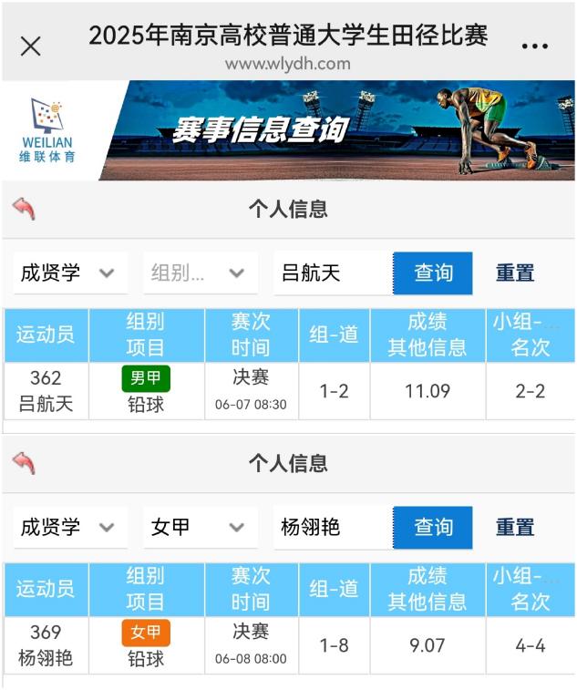 beat365田径队由体育教研室王青禾主任领队,在刘龙柱、徐小虎两位教练的带领下,共派出9名运动员参与甲组6个项目的比赛。经过两天的激烈角逐,运动员们在田径场上展现出成贤学子努力拼搏的竞技精神,校田径队队长吕航天取得男子铅球第二名,23级杨翎艳同学取得女子铅球第四名的优异成绩。