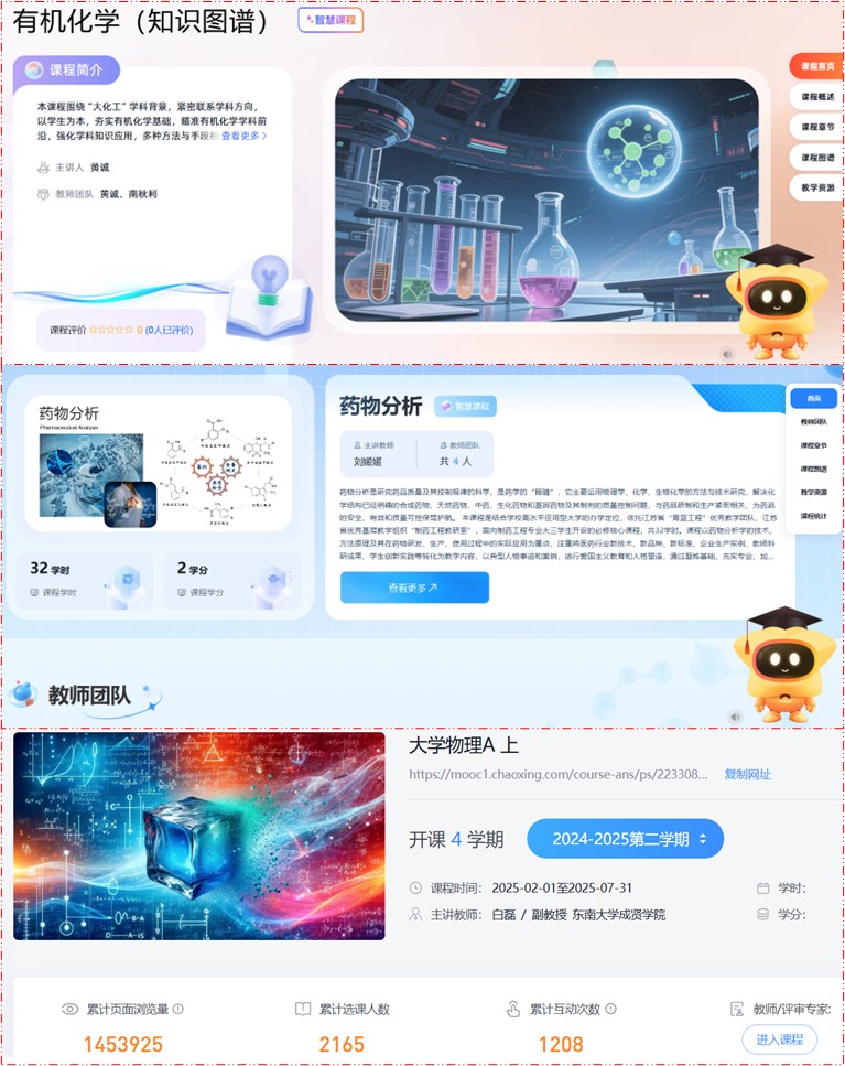 《有机化学》利用AI助教、知识图谱串联复杂合成与工业场景,训练工程思维与问题解决能力。《药物分析》通过数字人、智能体提供个性化药物质量解析与实验指导,基于数据优化教学,强化质量把控实践技能。《大学物理》借助AI工具构建原理可视化应用模型,运用智能辅导突出物理原理在工程技术中的运用。