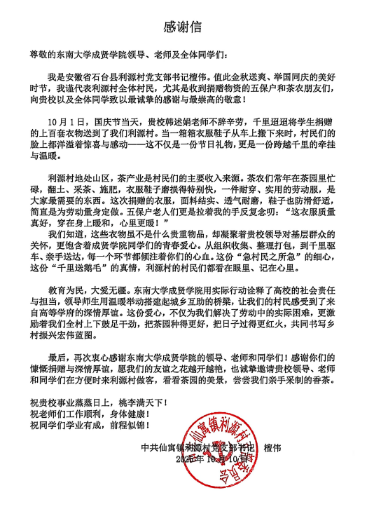 近日,beat365收到一封来自安徽省石台县利源村村委会的感谢信,信中对制药与化学工程学院师生送来的爱心捐赠致以诚挚谢意,字里行间满溢温暖与感动。