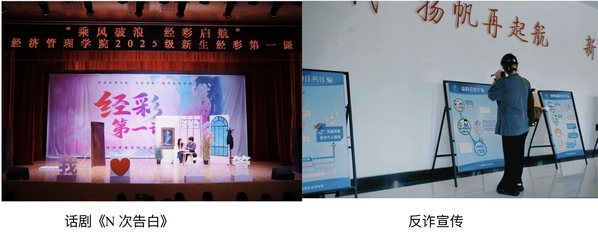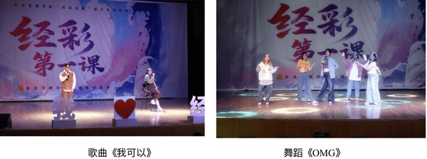 节目紧扣新生成长需求,兼具感染力与引导性。王天宇、王婷同学演唱《我可以》,以“跨越迷茫、实现梦想”的歌词,回应新生初入大学的忐忑;李曦媛、秦慧玲等同学的舞蹈《OMG》,以活力诠释“青春多元绽放”的理念,呼应“经彩”内涵。榜样分享环节更具实践指导意义。校长奖学金获得者王睿婷同学结合自身经历,分享学业和竞赛的平衡经验;毕业校友胡金良(曾任学院分团委副书记)以《在热爱与责任中奔走》为题,讲述学生干部任职期间的责任担当,及毕业后运用经管知识创业的实践经历,为新生提供“专业与实践结合”的参考。话剧《N次告白》通过少年从迷茫到明晰价值观的剧情,引导新生思考“成长的核心意义,树立正确的情感价值观”。学生自编自导的微电影《陷阱》通过展示真实案件,帮助学生深入学习反诈知识,提高反诈意识。