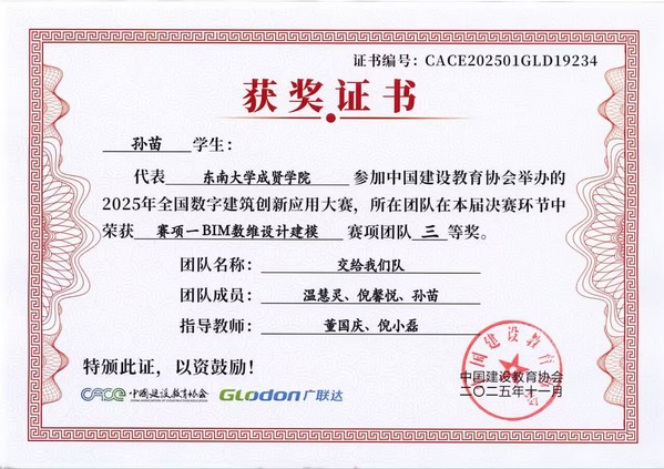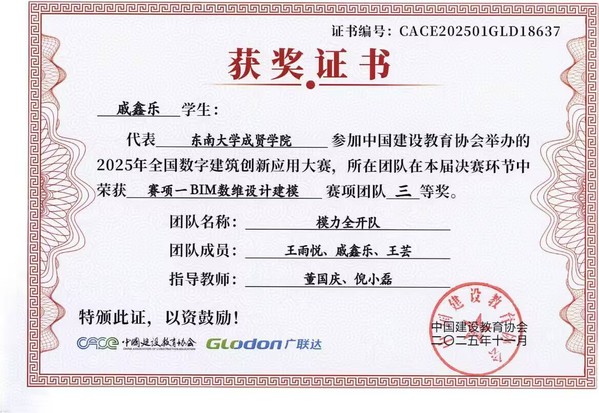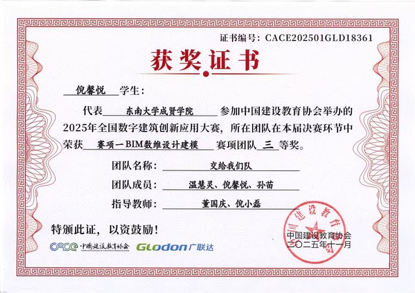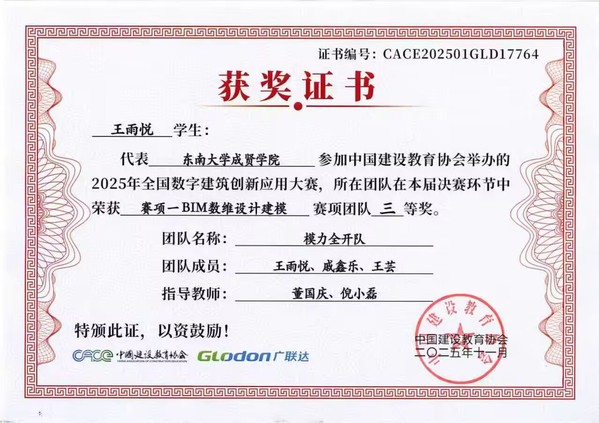 在第十七届全国数字建筑创新应用大赛中,beat365土木与交通工程学院传来捷报。由工程造价、工程管理专业学生王雨悦、戚鑫乐、王芸与温慧灵、孙苗、倪馨悦组成的两支队伍,在董国庆、倪小磊老师的指导下发挥出色,最终双双荣获全国三等奖。