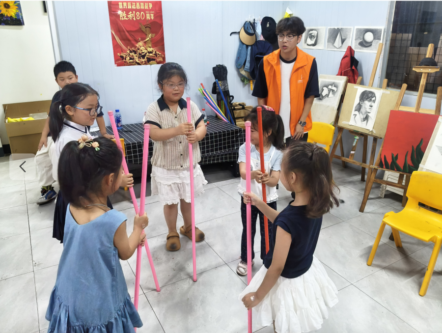 根据留守儿童的身心特点,团队精心设计了“不倒森林”、“珠行万里”等妙趣横生的互动游戏与团队合作项目。活动现场,孩子们的欢声笑语此起彼伏,大家在志愿者的引导下全情投入——“不倒森林”里,每个人都专注地守护着手中的杆子,在默契配合中体会团队协作的重要性;“珠行万里”时,孩子们小心翼翼地用管道传递着小球,在接力中学会了耐心与沟通。在这样轻松愉快的氛围里,原本有些腼腆的孩子渐渐放下了拘谨,主动与同伴交流互动。通过这些充满乐趣的活动,孩子们不仅在潜移默化中掌握了情绪管理的小方法和人际沟通的小技巧,更在一次次成功的合作中增强了自信心,深刻感受到了团队的温暖与力量,心灵在欢声笑语中得到了温柔的呵护与健康成长。