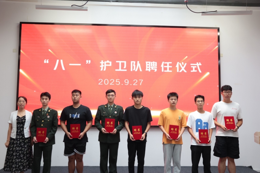 随后,仪式进入核心环节。首先举行八一护卫队聘任仪式与宣誓环节。在全场师生的注视下,学院领导为八一护卫队新成员颁发聘任证书,见证队员们正式肩负起“守护校园安全、服务师生”的使命。聘任仪式后,八一护卫队代表,造价2421班杨杭同学发言,他表示八一护卫队后续会履行安全职责,坚守岗位、认真巡逻,排查隐患、主动宣传,为建设平安校园贡献力量!