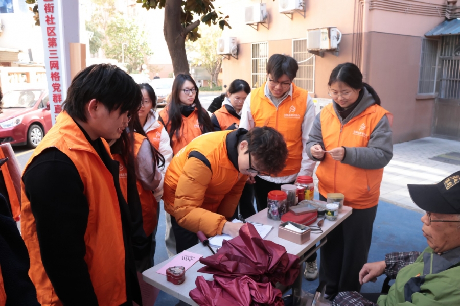 在全场热烈的掌声中,沈丹书记、徐永红书记与吴志佳先生共同为传承站揭牌,三位嘉宾与师生志愿者代表在牌匾前合影,定格下校社携手传承善意的重要时刻。揭牌仪式后,我校学子精心筹备的旧伞修缮志愿服务正式启动,将活动推向高潮。